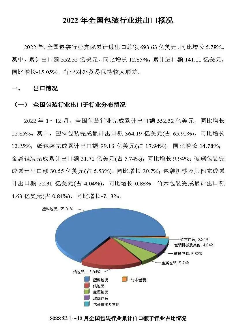 2月底,中國(guó)包裝聯(lián)合會(huì)發(fā)布了“2022年全國(guó)包裝行業(yè)進(jìn)出口概況”。根據(jù)報(bào)告顯示,2022年全國(guó)包裝行業(yè)完成累計(jì)進(jìn)出口總額693.63億美元,同比增長(zhǎng)5.78%。行業(yè)對(duì)外貿(mào)易保持較大順差。